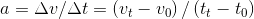 Rumus percepatan adalah a = v/t, yang menunjukkan nilai perubahan kecepatan terhadap waktu.
